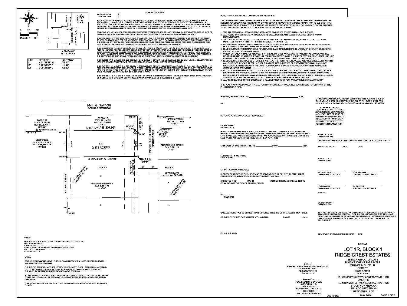 The Ellis County Commissioners’ Court will consider and act upon a plat application for Ridge Crest Estates, Lot 1R, Block 1, being a replat of Ridge Crest Estates, Lot 1, to adjust the lot lines. The property contains ± 0.372 acres of land, located southwest of the intersection of FM 664 and Ridge Crest Drive, Road and Bridge Precinct No. 1. A copy of the replat request is shown below.
